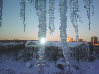 We have some huge icicles outside our bedroom window! I don’t think I’ve ever seen icicles this huge outside our house before! Those things are big enough to crash down and break something! Here’s a few pics: